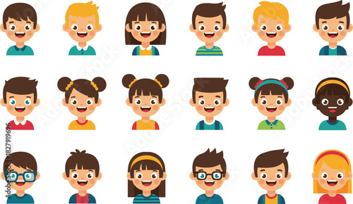 Cute kids avatar character set with diverse cartoon boy and girl faces, colorful hairstyles and expressions, flat vector illustration for education and design projects.
