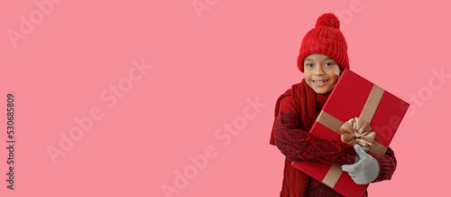 Cute little African-American boy in winter clothes and with Christmas gift on pink background with space for text