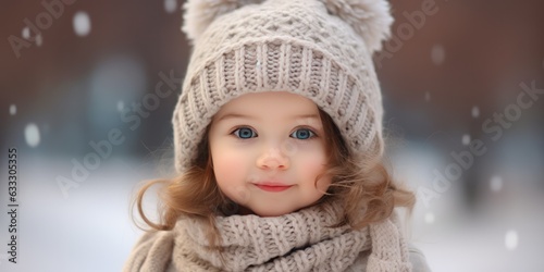 Cute little baby girl smiling wearing woolen cap and scarf and winter clothes with snow day in winter. Playing outside on Christmas holiday, generative ai