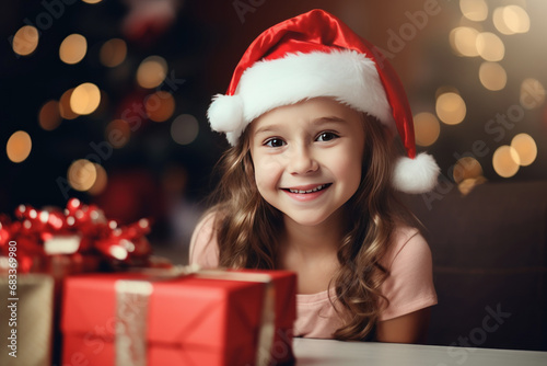 Cute little girl in santa clause red color hat celebrating christmas.
