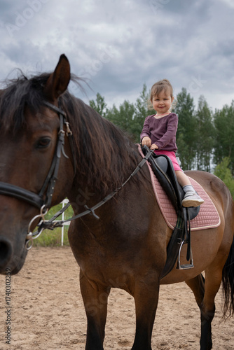 Cute little girl riding a horse outdoors. Pet therapy. Hippotherapy for young children, therapy after many serious diseases.