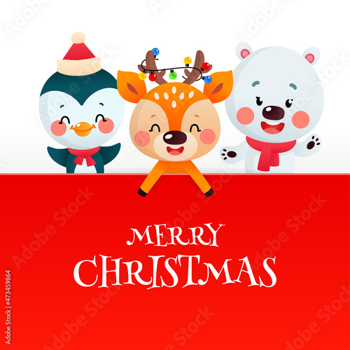 Cute Merry Christmas card with cartoon characters. Winter holiday illustration of a funny little deer, a penguin and a polar bear with a big red signboard on a white background. Vector 10 EPS.