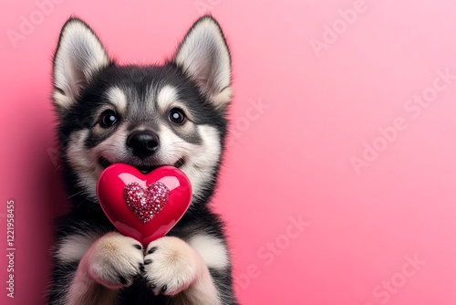 Cute norwegian elkhound canine with sparkling rhinestones red heart - sign of love, funny greeting card. Ad campaign visual idea layout. Norwegian elkhound - my desired dog. Cute dog photos.
