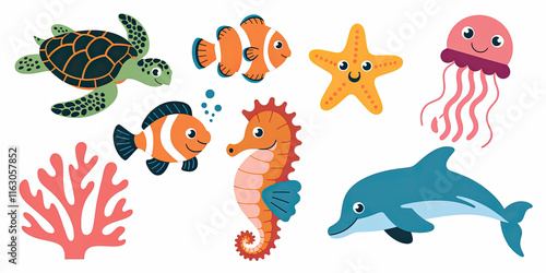 Cute Ocean Animals Cartoon Sea Life Illustrations Kids Dolphins Fish Turtle