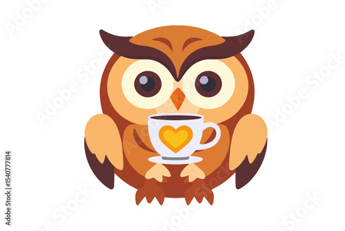 Cute Owl Illustration- Holding Coffee Cup with Heart- Warming Morning Beverage- Cartoon Owl Graphic for Kids- Perfect for Decor or Design Projects