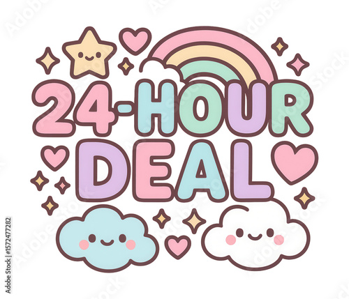 Cute pastel-themed bubble sticker with 24-HOUR DEAL in kawaii style, charming retail promo on transparent background.