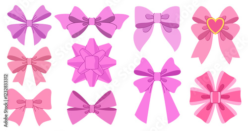 Cute pink decorative bows set. Tied bows for wrapping holiday gifts for Valentine's day, birthday and other holidays. Romantic holiday elements collection.