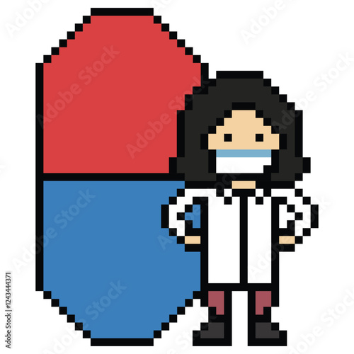 Cute pixel cartoon 8bit character woman doctor medicine care pill treat game care decoration pharmacist female doctor medicine hospital 8 bit lady pixel art game png vector.