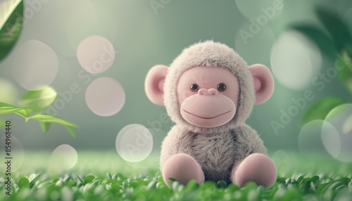 Cute plush monkey toy sitting on green grass with blurred nature background. Ideal for children's themes.