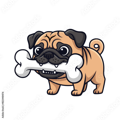 Cute Pug Dog Bite Bone vector cartoon illustration, Isolated on White Background