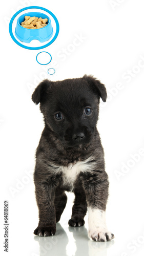 Cute puppy dreaming of dry foods, isolated on white