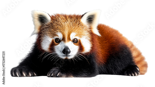 Cute red panda lies on transparent background showcasing its fluffy fur and distinctive facial markings. animal relaxed pose and vibrant colors create charming and engaging image