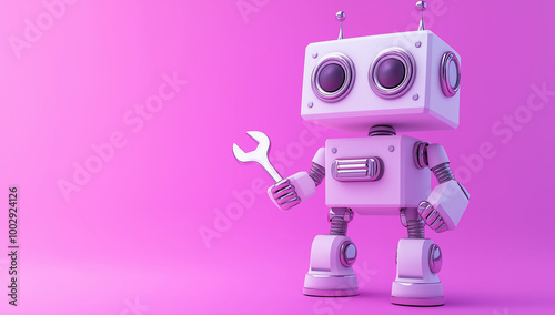 Cute Robot Holding Wrench on Pink Background