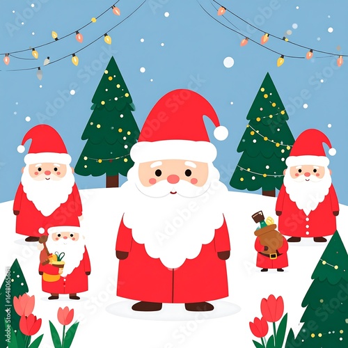 Cute Santa Claus characters in a snowy winter scene