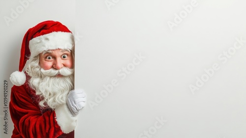 Cute Santa peeping behind a board. Christmas holiday greeting card design background template.