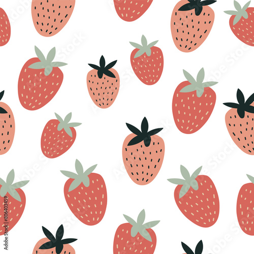 cute seamless pattern with strawberries on a white background, illustration in doodle style