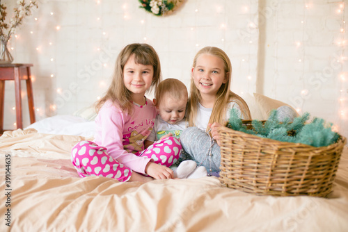 Cute sisters and little brother in pajamas have fun in in a Scandinavian style bedroom decorated with Christmas garlands and needles on a large bright bed. Christmas mood. Christmas mood. Family time