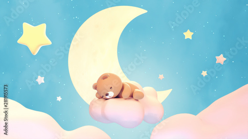 Cute sleeping bear on lake green color background. Beautiful pastel pink clouds, yellow crescent moon, and stars. 3d rendering picture.
