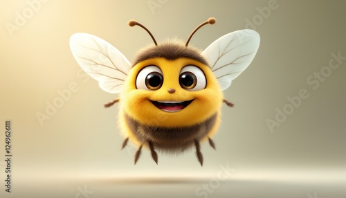 Cute Smiling Bee Character Flying with Wings Outspread on Light Background