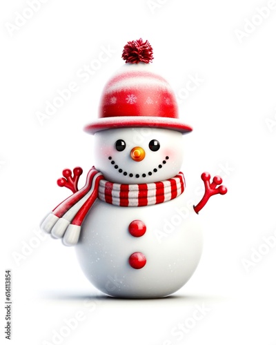 Cute snowman with red hat and scarf on white background in cartoon style. Generative AI.
