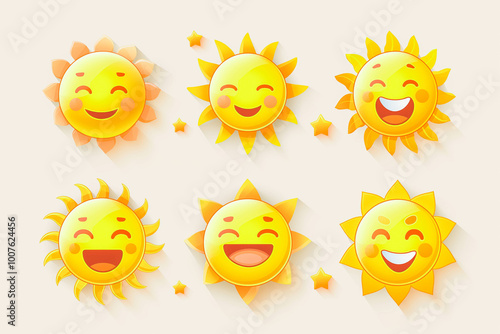 Cute suns. Sunshine, cute smiling faces. Set of funny suns