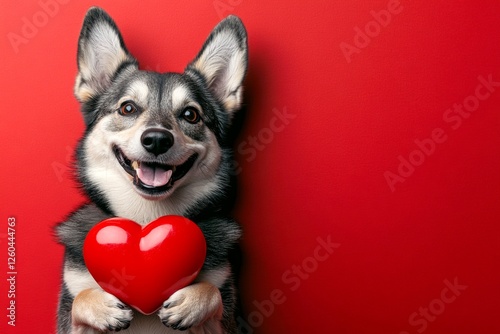 Cute swedish vallhund canine with critter toy red heart - emblem of love, funny greeting card. Swedish vallhund - my preferred dog. Ad concept picture. Heart and dog. Cute puppy love.