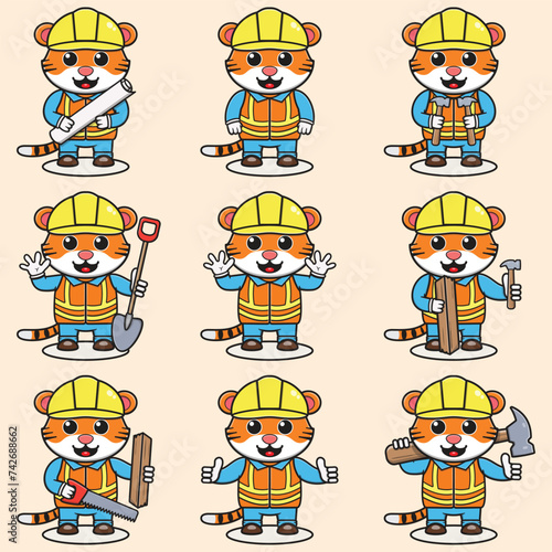 Cute Tiger Construction Contractor Illustration. Vector illustration of a cute building foreman Tiger . Cute Tiger construction worker cartoon. Flat Cartoon Style.