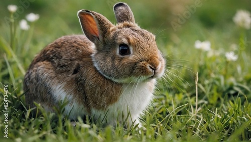 Cute tiny rabbit hare sitting on green grass field meadow. Beautiful bunny portrait wildlife animal photography illustration wallpaper concept.