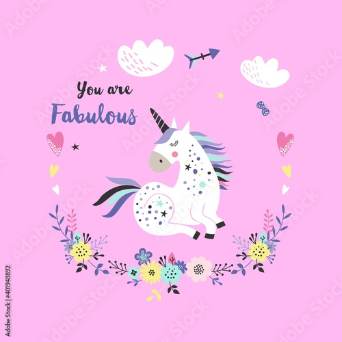 Cute unicorn greeting card. Magical unicorn vector poster.