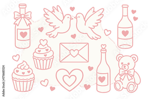 Cute Valentine's Day linear clipart collection with pink girly coquette y2k aesthetic, vintage wine bottles, doves, cupcakes, teddy bear, love hearts, romantic doodles set