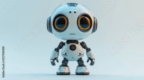 Cute white robot with big eyes, standing against a light blue background.