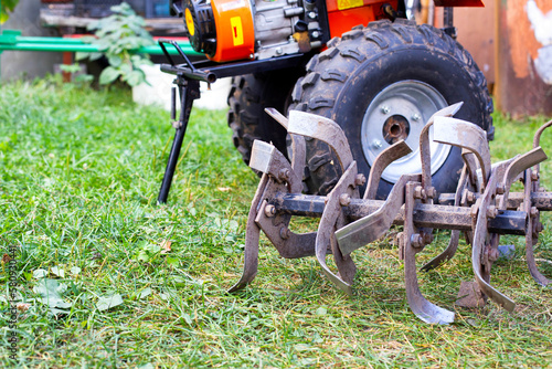 cutters complete with walk-behind tractor for work on the ground. Technique for agriculture. Motor cultivator. Copy space for text
