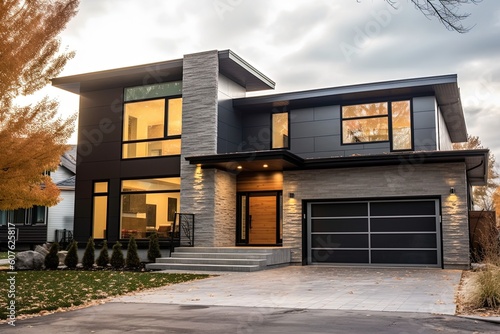Cutting-Edge Features and Prestigious Style: A Newly Developed Home with Dark Gray Siding and Natural Stone Cladding, Complete with Single Car Garage, generative AI