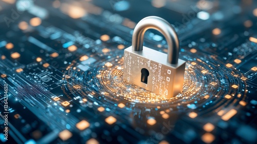 Cyber Security Digital Padlock on Futuristic Circuit Board