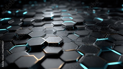 Cybernetic abstract background with futuristic layered grid of geometric plates and hex patterns, matte black with hints of silver and cyan, industrial tech feel, ultra sharp 8K render