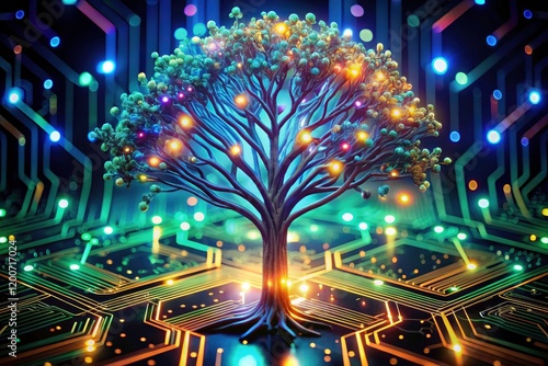 Cybernetic tree: glowing circuits branch, representing rapid technological advancement and AI innovation.