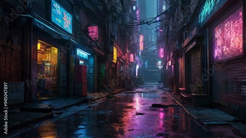 Cyberpunk-Inspired Urban Street with Glistening Reflections of Neon Signs