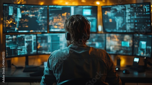 Cybersecurity expert monitoring multiple screens in a control room during a late-night shift