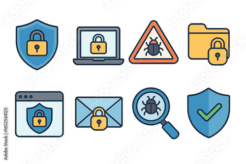 Cybersecurity icon set. Internet data protection, online safety and privacy symbol. Vector icon for virus scan, malware detection, firewall and computer security concept.