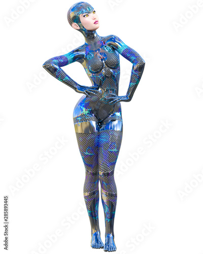 Cyborg Woman futuristic metallic neon suit.