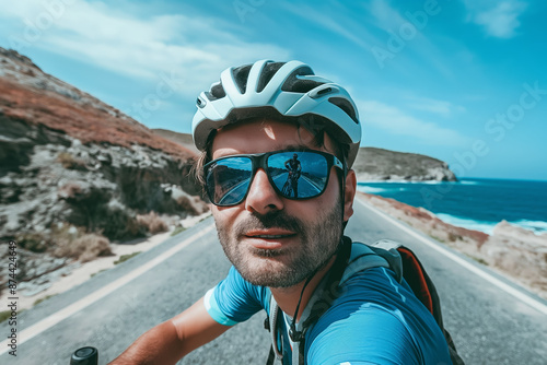 Cyclist on Coastal Road Enjoying Sunny Day with Ocean View