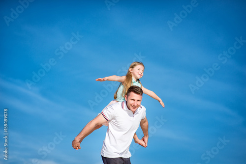 Dad and little girl daughter playing on the beach, fly, run, laugh at the blue sky background