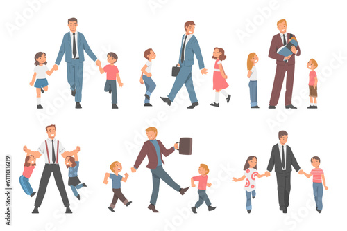 Dad Businessman Wearing Suit and Tie Walking and Playing with His Son and Daughter Vector Set