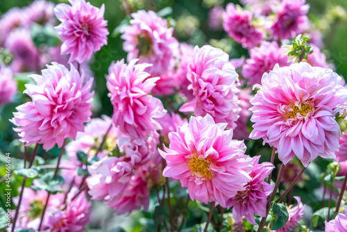Dahlia blooms in an ecological garden, a perennial tuber plant that usually blooms in summer and fall, originated from Mexico. Flowers are used to decorate the space and freshen the air