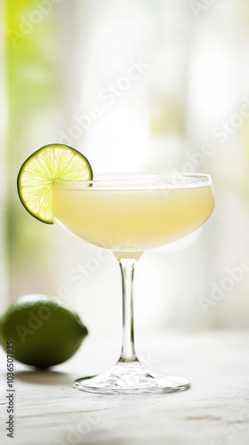 Daiquiri cocktail with pale liquid and lime wheel garnish in a chilled coupe glass. White background highlighting the smooth and elegant presentation.