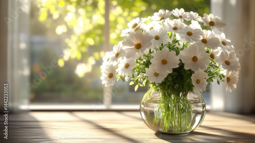 Daisy Bouquet in Glass Vase, Sunny Window Background daisies daisy bouquet white flowers glass vase