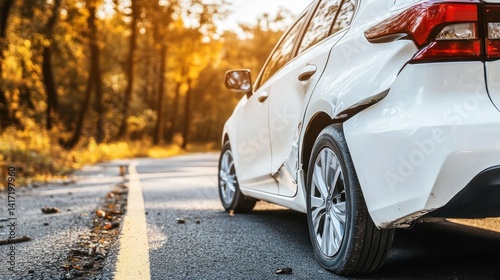Damaged Car on Autumn Road: A Scene of Accident and Fall Colors