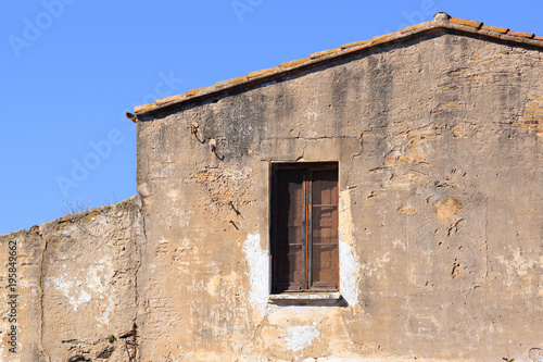 Damaged facade of a rural house used as a farmhouse tourism. Empty copy space for Editor's text.