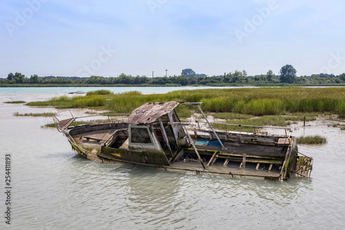 damaged wreck in a lagoon