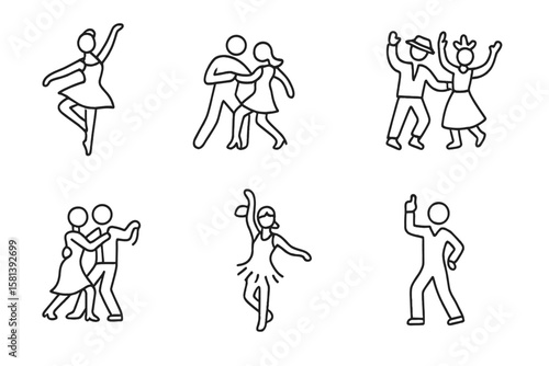 Dance line icon set of 6. Vector pictograms of people in various dancing styles like ballet, salsa, tango, folk, and disco. Minimalist icons for party, performance, and culture.